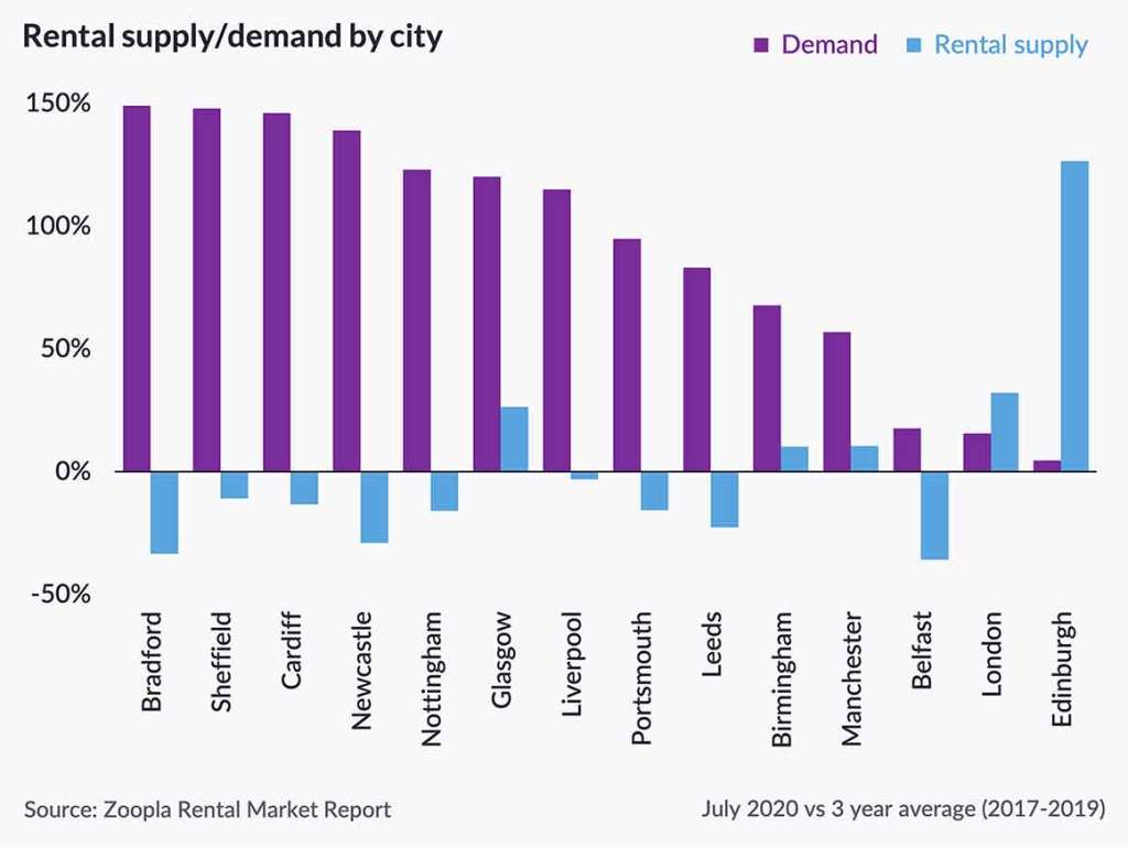 There are various reasons for this increase in supply. However, the primary and most obvious two are both Edinburgh’s impending stricter laws on Airbnb and holiday lets, along with that global pandemic thing that’s happening right now. Both resulting in a massive number of Airbnb and short term let property being ‘dumped’ onto the long term rental market in a short space of time. This, coupled with the decrease in generally more transient student population with Universities providing most if not all classes online, this has created a very different shape to the graph shown for Edinburgh, in comparison to the rest of the UK.